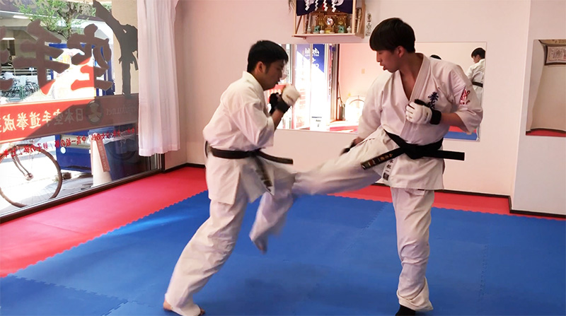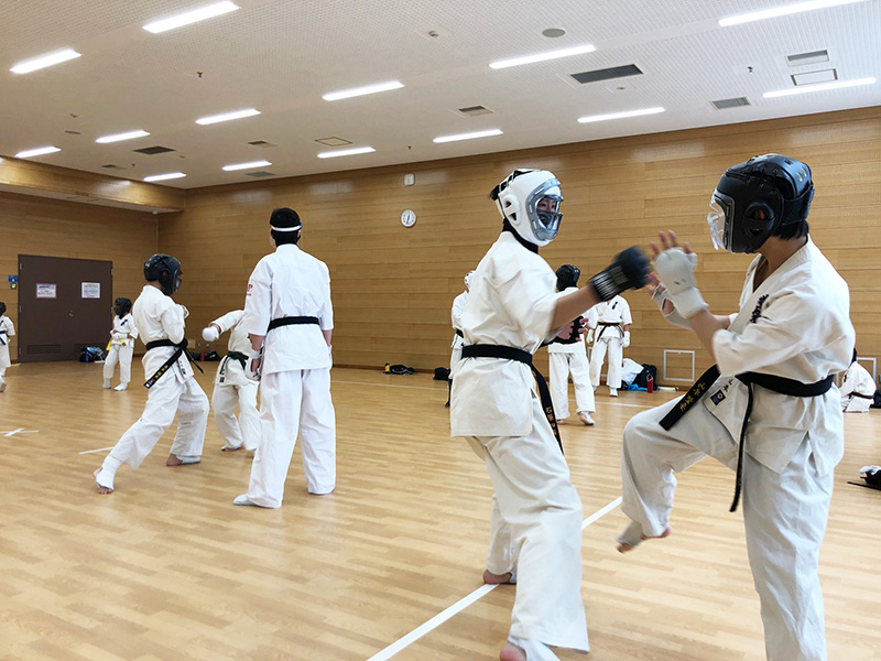 組手稽古:初歩は先ず受け技を習得し次にしっかりと技を当てる稽古を行って行きます。そして相手との距離感覚が意識でき、力の加減も制御できるようになってきたらヘッドガードを着用し顔面突きも加えた組手へと進んでいきます。